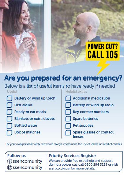 Please see below a useful flyer to help you remain Winter Aware produced by Scottish & Southern Electricity Networks. This information is particularly useful for vulnerable people who may wish to join the Priority Services Register.