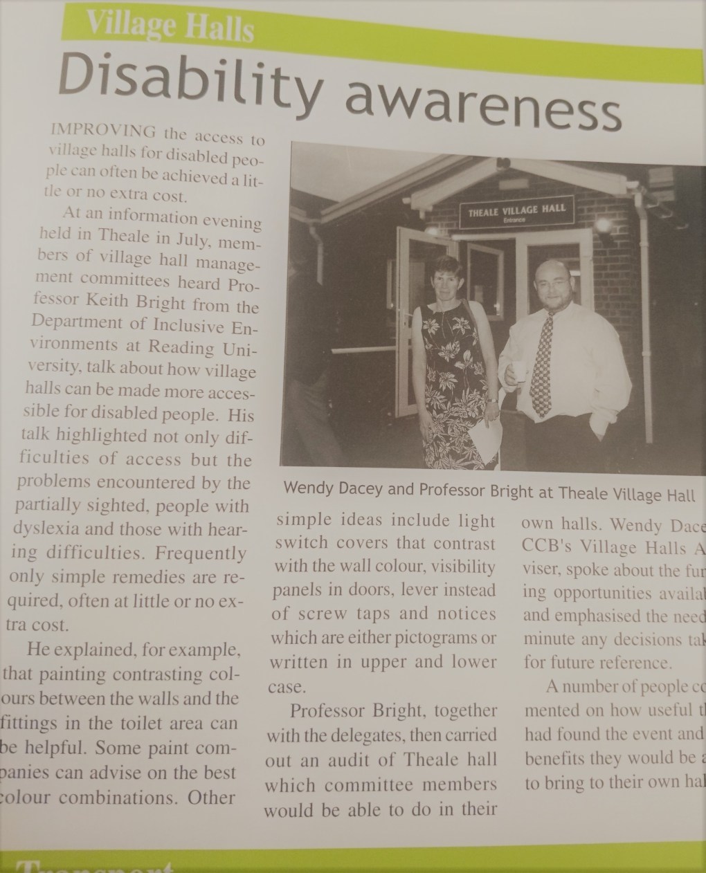 At an information evening held in Theale in July 2002 members of village hall management committees heard Professor Keith Bright from the Department of Inclusive Environments at Reading University, talk about how village halls can be made more accessible for disbaled people. His talk highlighted not only difficulties of access but the problems encountered by the partially sighted, people with dyslexia and those with hearing difficulties. Frequently only simple remedies are required, often a little or no extra cost.