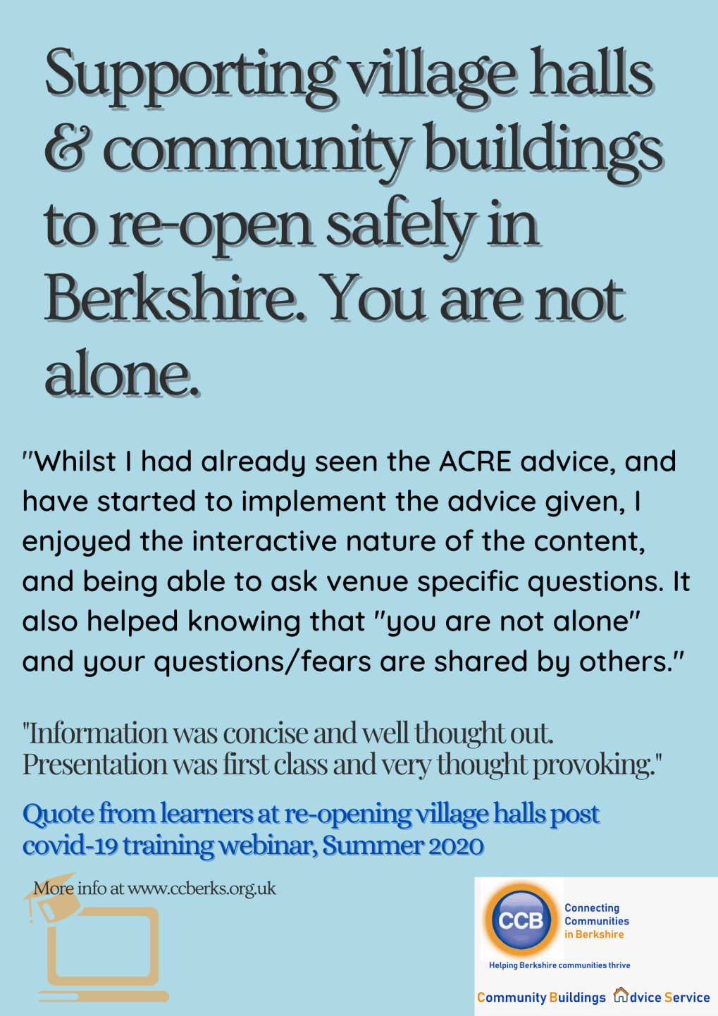 Village Halls and Community Buildings play a major part in community life in Berkshire and pre Covid provided a fantastic meeting point for fitness & dance classes, indoor markets, afternoon teas, weight management programs, brownies/cubs meetings, lunch clubs, birthday parties, toddler groups, theatre performances and many more ‘coming together’ opportunities. The role that village halls play in helping local people to combat loneliness and isolation should not be undervalued and like many other groups and businesses have suffered from a lack of income during lockdown and a new set of seemingly confusing and ever-changing rules in re-opening. CCB’s Community Buildings Advisor Kate Meads, with help from our national network Action with Communities in Rural England (ACRE), pulled together a course specifically designed to help and re-assure trustees regarding how they can re-open safely and measures they need to arrange to ensure that can happen safely. The course was very well attended and received with some fantastic comments from learners.