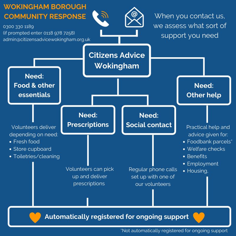 Citizens Advice Wokingham are operating One Front Door to link you with the right level of support – working with Wokingham Borough Council and organisations such as local foodbanks, Wokingham Volunteer Centre, First Days, Involve, Link Visiting Scheme, Age UK Berkshire and many more – including mental health and wellbeing support. They have a long list of charities and community groups operating across the area. They have setup this page on our website so that you can explain your issue via a form if that suits you best. They may need to give you a call back just to check some things out – the form is available 24/7. If you are referring someone else you MUST Have their explicit permission.