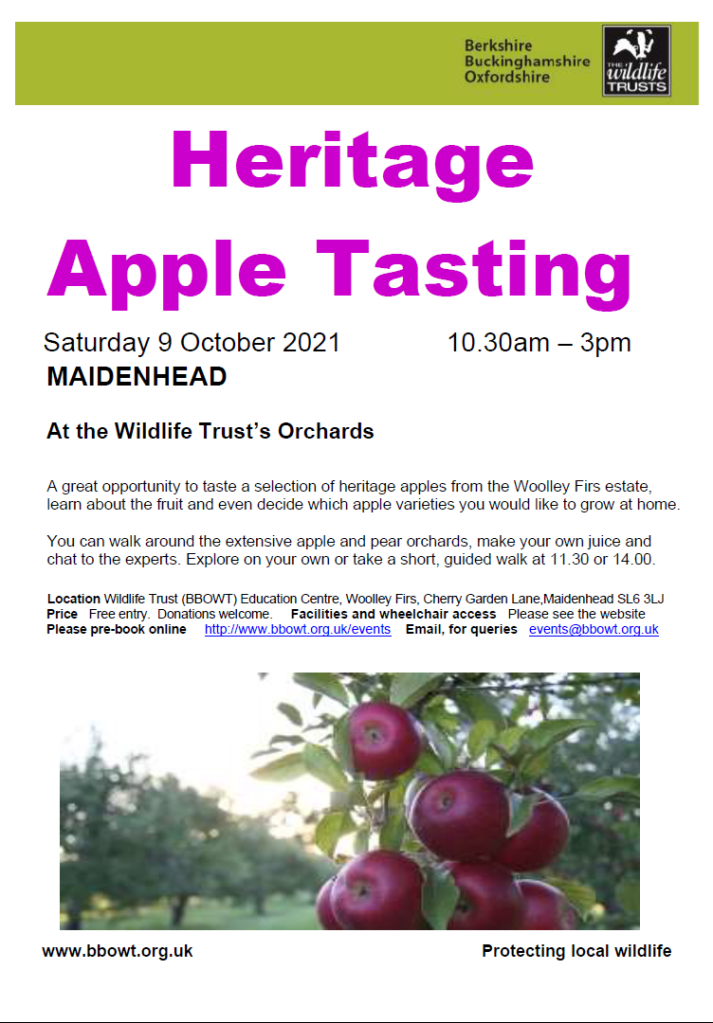 Heritage Apple Tasting in Maidenhead – 9th October 2021 Image Leave a comment 29/09/2021 Connecting Communities in Berkshire Share this: Click to share on X (Opens in new window) X Click to share on Facebook (Opens in new window) Facebook Click to email a link to a friend (Opens in new window) Email Like Loading... Related