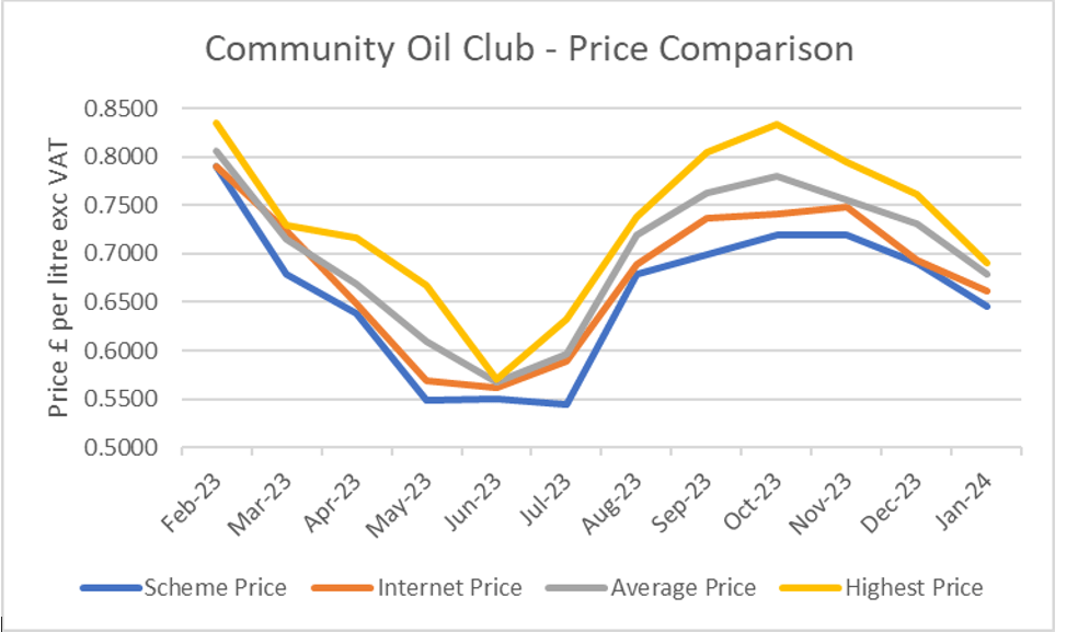 The prices the Oil Club has achieved for the last 12 months are outlined below. There are orders placed every month other than December. All prices are exclusive of 5% VAT, the month shows the month the oil was DELIVERED rather than negotiated.