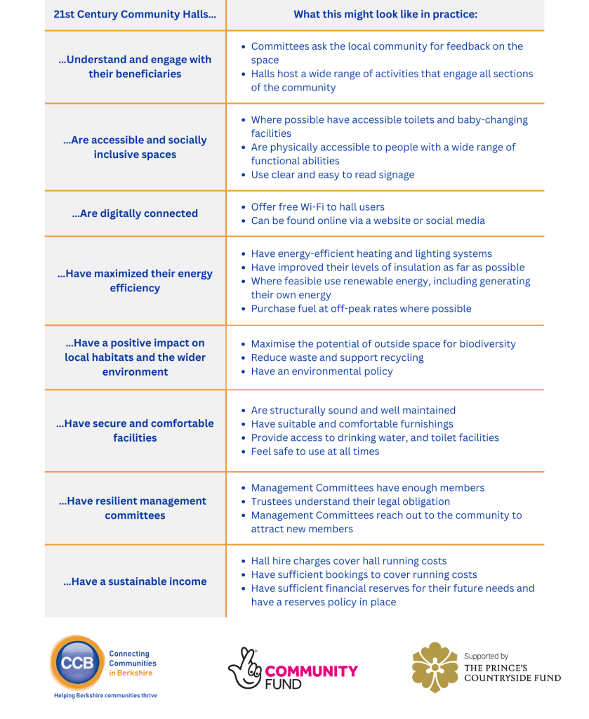 Examples of features of a 21st Century community hall might look like are below. Examples are for guidance rather than a set of criteria or a checklist. Other examples and approaches may be taken by committees.
