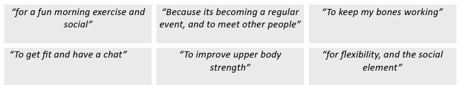 The exercise classes we worked with village halls to set up were particularly targeted at people who may have not accessed classes before including youth groups, older people and those with long-term health issues.